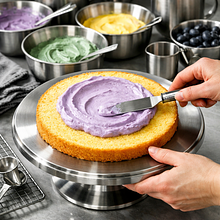 Na talerzu lub paterze połóż pierwszy (dolny) krążek biszkoptu. Nałóż równomiernie jedną porcję kolorowego kremu (około 80–90 g) i wygładź szpatułką, zostawiając cienki margines brzegów. Nałóż drugi krążek biszkoptu i powtórz z kolejnym kolorem. Kontynuuj aż do ostatniej warstwy, kończąc kremem z ostatniego odcienia. Po ułożeniu wszystkich warstw rozsmaruj cienką warstwę kremu po bokach, aby „zafiksować” okruszki (tzw. crumb coat) i schłódź tort w lodówce 20–30 minut. Po schłodzeniu nałóż drugą, dekoracyjną warstwę kremu i wygładź bok i wierzch.