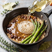 Jeśli używasz wina białego wytrawnego (opcjonalne), wlej 100 ml na patelnię, zwiększ ogień i gotuj 1–2 minuty, zeskrobując przyrumienione kawałki drewnianą łyżką (deglazowanie). Jeśli nie używasz wina, wlej 100–150 ml ciepłego bulionu i postępuj tak samo. Dodaj liść laurowy i ziele angielskie oraz tymianek. Włóż z powrotem cielęcinę do patelni i wlej resztę bulionu tak, by sięgał do połowy wysokości mięsa (ok. 300–400 ml). Doprowadź do delikatnego wrzenia.