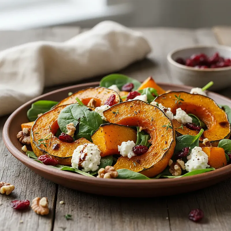 Ta sałatka to kwintesencja jesieni na talerzu. Łączy w sobie niezwykłe bogactwo smaków, tekstur i kolorów, tworząc danie, które jest zarówno sycące, jak i eleganckie. Sercem kompozycji jest pieczona dynia hokkaido, której naturalna słodycz zostaje pogłębiona w procesie karmelizacji w piekarniku. Jej miękkość idealnie kontrastuje z pikantnymi, lekko pieprznymi liśćmi rukoli. Wyrazisty, kremowy i lekko słony ser kozi dodaje całości charakteru, a jego intensywność jest doskonale równoważona przez słodko-kwaśną, suszoną żurawinę. Chrupkości nadają prażone orzechy włoskie, które wprowadzają orzechową nutę. Całość spaja aksamitny dressing na bazie oliwy z oliwek, octu balsamicznego i miodu, który podkreśla wszystkie smaki. Sałatka jest nie tylko pyszna, ale i zjawiskowo piękna – głęboka zieleń rukoli, intensywny pomarańcz dyni i biel sera tworzą apetyczną mozaikę. Idealnie sprawdzi się jako lekki, samodzielny obiad, wykwintna przystawka lub dodatek do dań mięsnych.