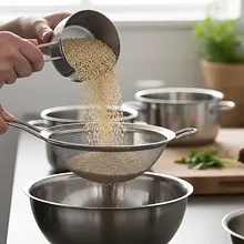W czasie gdy dynia się piecze, przygotuj komosę. Wsyp odmierzoną ilość komosy na bardzo drobne sitko. Płucz ją pod zimną, bieżącą wodą przez około minutę, energicznie mieszając i pocierając ziarna dłońmi. Jest to kluczowy krok, który usuwa z ziaren naturalną, gorzką otoczkę zwaną saponinami.
