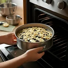 Wstaw formę do nagrzanego piekarnika i piecz przez 50-60 minut w temperaturze 175°C. Po 40 minutach sprawdź wierzch: jeśli zbyt szybko się rumieni, przykryj luźno folią aluminiową. Po 50 minutach dokonaj testu patyczkiem — wbij drewniany patyczek w środek; jeśli wychodzi czysty lub z kilkoma wilgotnymi okruchami, ciasto jest upieczone. W przeciwnym razie piecz kolejne 5-10 minut.