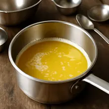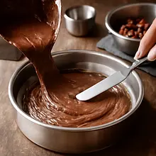 Roztop pozostałe 110 g masła w rondelku na małym ogniu. Gdy masło będzie płynne, zdejmij z ognia i odstaw na 1 minutę. W osobnej dużej misce ubij 180 g jajek z 180 g cukru kryształ na jasną, puszystą masę — użyj miksera na średnich obrotach przez 3-4 minuty (masa powinna być jaśniejsza i lekko puszysta). Do ciepłego (nie gorącego) masła dodaj 100 ml mleka i dokładnie wymieszaj. Wlej masę masłowo-mleczną cienkim strumieniem do ubitych jajek, mieszając delikatnie szpatułką. Następnie dodaj przesiane suche składniki (mąka, kakao, proszek) w dwóch porcjach i delikatnie łącz szpatułką ruchem składania, aż nie będzie widocznych suchych śladów mąki — nie mieszaj zbyt długo (ok. 20-30 sekund od momentu połączenia). Ciasto powinno być gęste, ale płynne i lejące.