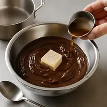 Dodaj masło i sól (oraz likier jeśli używasz): gdy ganache jest już gładka, dodaj pokrojone masło i szczyptę soli. Jeśli chcesz aromatyzować trufle, dodaj teraz likier rumowy (30 ml). Delikatnie mieszaj aż masło całkowicie się rozpuści i masa nabierze jedwabistej, lekko błyszczącej struktury. Spróbuj masy — powinna być intensywnie czekoladowa, gładka, lekko słona.