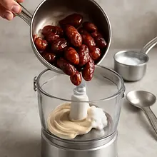 Jeśli daktyle są twarde, zalej 200 g daktyli 120 ml gorącej wody i odstaw na 10–15 minut do zmięknięcia. Odsącz (zachowaj trochę wody z namaczania).