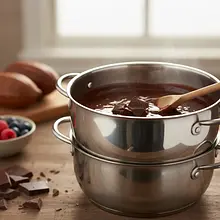 Przygotuj kąpiel wodną do rozpuszczenia czekolady. Do małego garnka wlej wodę na wysokość około 2-3 cm i zagotuj. Zmniejsz ogień do minimum. Na garnku umieść metalową lub szklaną miskę, która będzie większa niż średnica garnka i nie będzie dotykać powierzchni wody. Do miski wrzuć połamaną na kostki gorzką czekoladę (70%) oraz pokrojone w kostkę masło. Mieszaj powoli silikonową szpatułką, aż składniki całkowicie się rozpuszczą i połączą w gładką, lśniącą masę. Zdejmij miskę z garnka i odstaw na bok do lekkiego przestudzenia na około 5-10 minut.