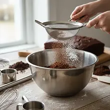 W osobnej, mniejszej misce wymieszaj suche składniki: mąkę pszenną, kakao i szczyptę soli. Przesiej je przez sitko bezpośrednio do masy czekoladowej. Używając szpatułki, bardzo delikatnie wymieszaj wszystko, wykonując tylko kilka ruchów, aż suche składniki znikną w masie. W cieście mogą pozostać niewielkie grudki mąki – to w porządku.