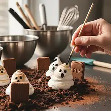 Na koniec udekoruj cmentarz duchami. Za pomocą wykałaczki i czarnego barwnika spożywczego (lub roztopionej czekolady) namaluj małe oczka na wystudzonych bezach. Gotowe duszki delikatnie poustawiaj na powierzchni ciasta, między nagrobkami. Ciasto jest gotowe do podania!