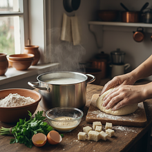 Gdy mięso się piecze, wróć do knedlików. Wyrośnięte ciasto przełóż na lekko oprószony mąką blat. Krótko zagnieć, aby usunąć pęcherze powietrza. Podziel ciasto na dwie równe części i z każdej uformuj podłużny wałek (knedlik) o długości około 20-25 cm i średnicy 5-6 cm. Ułóż uformowane knedliki na desce, przykryj ściereczką i pozostaw na kolejne 15-20 minut do napuszenia.