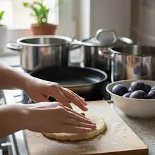 Każdy plasterek ciasta rozpłaszcz w dłoniach, tworząc okrągły placek o średnicy około 8-10 cm. Na środku każdego placka połóż jedną, umytą i osuszoną śliwkę (bez pestki). Możesz dodatkowo posypać śliwkę odrobiną cynamonu dla aromatu. Następnie dokładnie zlep brzegi ciasta nad śliwką, formując zgrabną, okrągłą kulkę. Upewnij się, że nie ma żadnych dziur.