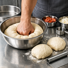 Użyj dużej miski — ciasto wymaga miejsca do wyrabiania. Sól nie powinna dotykać bezpośrednio drożdży w czasie dodawania.