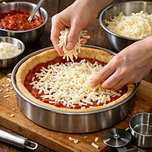Kolejność (ser pod spodem, sos w środku, ser na górze) to klasyczny trick deep dish — zapobiega nasiąkaniu spodu i daje kremową strukturę. Upewnij się, że brzegi są dobrze uszczelnione.