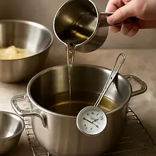 Wlej olej do szerokiego, wysokiego garnka (ok. 6–8 cm warstwa oleju) i rozgrzej do temperatury 170–175°C. Jeśli nie masz termometru, włóż drewnianą łyżkę — wokół powinny się tworzyć drobne, ciągłe bąbelki. Smaż oponki partiami (maks. 3–4 naraz, w zależności od wielkości garnka) po 1,5–2 minuty z każdej strony, aż staną się złociste. Unikaj przekładania zbyt często — pozwól im się zrumienić, a następnie obróć.
