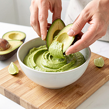 Do miski z miąższem awokado dodaj jogurt naturalny, olej rzepakowy, startą skórkę limonki i połowę wyciśniętego soku. Użyj widelca lub tłuczka do ziemniaków i rozgnieć awokado z resztą składników na gładką, ale nie zupełnie jednolitą masę — celuj w kremową konsystencję z drobnymi kawałkami dla tekstury. Jeśli chcesz bardziej gładki dip, użyj blendera ręcznego przez kilka sekund.