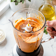 Przełóż ugotowaną marchew do blendera kielichowego lub wysokiego naczynia do blendera ręcznego. Dodaj starty imbir, posiekany czosnek, jogurt naturalny (200 g), olej rzepakowy (30 g), sok z cytryny wyciśnięty z cytryny (60 g), 1 szczypta soli (1 g), 1 szczypta pieprzu (1 g) oraz, jeśli używasz, miód (30 g). Miksuj na wysokich obrotach przez 1–2 minuty, aż masa będzie całkowicie gładka i kremowa. Jeśli dip jest za gęsty, dodaj stopniowo zachowaną wodę z gotowania (po 10–15 ml) aż do uzyskania pożądanej konsystencji.