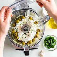 Jeśli używasz blendera lub malaksera: włóż odsączone oliwki, rozgnieciony twaróg, śmietanę i połowę posiekanej natki do misy. Dodaj 2 ząbki czosnku (10 g) i 15 g oleju z oliwek. Jeśli nie masz blendera, użyj noża do drobnego siekania oliwek i wymieszaj składniki w misce.