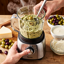 Pulsuj blenderem 6–8 razy po 1–2 sekundy, a następnie miksuj krótko przez 5–10 sekund, aż masa stanie się kremowa, ale nie całkowicie jednolita — powinny zostać drobne kawałki oliwek dla tekstury. Cały proces miksowania nie powinien trwać dłużej niż 20 sekund, aby dip nie stał się zbyt płynny.