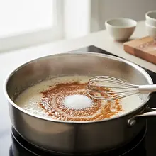 Przygotuj mokrą bazę. W małym rondelku umieść olej kokosowy, erytrytol, cynamon i sól. Podgrzewaj na małej mocy palnika, mieszając ciągle małą trzepaczką lub łyżką, aż olej kokosowy całkowicie się rozpuści, a erytrytol rozpuści się i połączy z olejem. Mieszanina powinna być płynna i pachnąca. Jeśli używasz opcjonalnego ekstraktu waniliowego, dodaj go na samym końcu, po zdjęciu rondelka z ognia i wymieszaj.