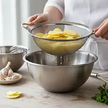 Pokrój ziemniaki na bardzo cienkie, niemal przezroczyste plasterki o grubości około 1-2 mm. Najlepiej użyć do tego mandoliny kuchennej, która zapewni idealnie równe plasterki. Jeśli jej nie masz, użyj bardzo ostrego noża i tnij powoli i ostrożnie. Pokrojone plasterki od razu wrzucaj z powrotem do miski z zimną wodą.