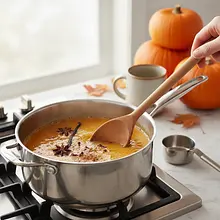 Przygotuj bazę smakową. W małym rondelku o grubym dnie umieść 120g purée z dyni, 100g cukru trzcinowego oraz 120ml wody. Dodaj wszystkie przyprawy: 3g cynamonu, 1.5g imbiru, szczyptę gałki muszkatołowej i szczyptę mielonych goździków. Użyj silikonowej szpatułki lub trzepaczki, aby wymieszać wszystko na gładką, jednolitą masę jeszcze przed podgrzaniem.