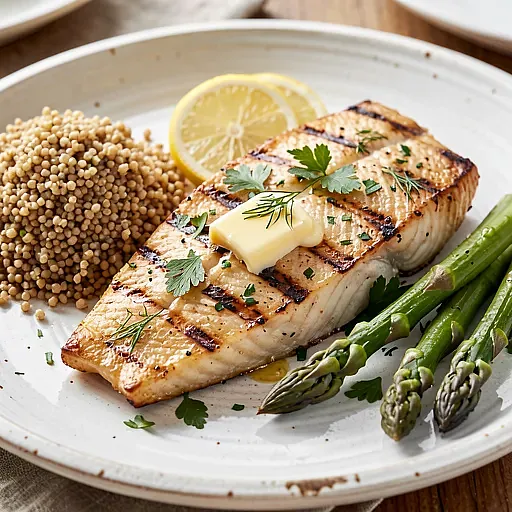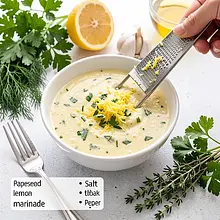 Przygotuj marynatę: na deskę zetrzyj skórkę z cytryny (tylko żółtą część) za pomocą drobnej tarki, a następnie przekrój cytrynę i wyciśnij sok. Obierz czosnek i przeciśnij przez praskę lub drobno posiekaj. W misce połącz olej rzepakowy (30 g), sok z połowy cytryny (ok. 30 ml), startą skórkę z cytryny, czosnek (10 g), drobno posiekany koperek (30 g), posiekaną natkę pietruszki (30 g), tymianek (5 g), sól (5 g) i pieprz czarny (1 g). Wymieszaj energicznie widelcem lub trzepaczką przez około 20–30 sekund, aż składniki połączą się w jednorodną emulsję.