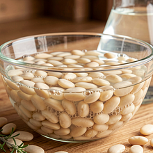 Dzień wcześniej: Przesortuj 250 g fasoli białej, usuwając uszkodzone ziarna i kamyczki. Przełóż do dużej miski i zalej zimną wodą tak, aby woda przykrywała fasolę przynajmniej o 5 cm. Odstaw na 8–12 godzin (najlepiej na noc). Po namoczeniu fasola znacząco zwiększy objętość — to normalne.