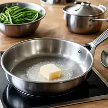 Rozgrzej patelnię o średnicy 24-28 cm na średnim ogniu. Dodaj masło (50 g) i pozwól mu się rozpuścić powoli — obserwuj, aż zacznie się pienić i nabierać lekko orzechowego zapachu (około 1-2 minut). Jeżeli używasz czosnku (opcjonalnie), przeciśnij lub drobno posiekaj 2 ząbki (10 g) i dodaj do masła na ostatnie 30 sekund rozpuszczania, mieszając — uważaj, aby go nie przypalić (przypalony czosnek zrobi smak gorzki).