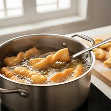 W szerokim, płaskim garnku lub na głębokiej patelni rozgrzej smalec lub olej. Tłuszczu powinno być na tyle dużo, aby faworki mogły w nim swobodnie pływać (ok. 4-5 cm głębokości). Rozgrzej go do temperatury około 175-180°C. Jeśli nie masz termometru, możesz przeprowadzić test: wrzuć mały kawałek ciasta do tłuszczu. Jeśli od razu wypłynie na powierzchnię i zacznie się intensywnie smażyć, otoczony masą bąbelków, tłuszcz jest gotowy. Jeśli opadnie na dno, jest za zimny. Jeśli od razu się przypali, jest za gorący.
