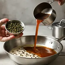 Zdejmij sos z ognia i dodaj zimne kawałki masła (50 g) — po jednym lub dwóch naraz, energicznie mieszając, aż masło się rozpuści i sos stanie się gładki i połyskujący. Jeśli używasz musztardy Dijon, dodaj 15 g teraz i dokładnie wymieszaj. Spróbuj i dopraw solą oraz pieprzem według smaku.