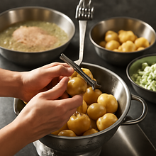 Kiedy ziemniaki są miękkie (sprawdzono widelcem), odcedź je dokładnie w durszlaku. Włóż gorące ziemniaki z powrotem do garnka, dodaj 15 g masła i posiekaną natkę pietruszki (10 g) — jeśli używasz. Energicznie potrząsaj garnkiem lub delikatnie mieszaj łyżką, aby masło się rozpuściło i pokryło ziemniaki. Dopraw solą i pieprzem do smaku.