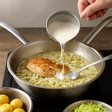 Zdejmij sos z ognia na chwilę i delikatnie wmieszaj śmietanę 18% (150 g). Wróć na niewielki ogień i podgrzewaj 1-2 minuty, nie dopuszczając do wrzenia (śmietana może się zwarzyć przy zbyt wysokiej temperaturze). Dodaj sok z cytryny (20 g), dopraw solą i pieprzem do smaku. Sos powinien być kremowy, gładki i lekko połyskliwy.