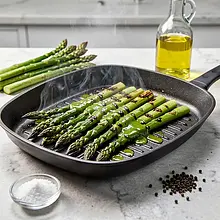 Rozgrzej patelnię grillową na średnio-wysokim ogniu (najlepiej 7/10 mocy) przez 4–5 minut — powinna być gorąca i sucha, aż zacznie delikatnie dymić. Skrop szparagi olejem rzepakowym (rozprowadź dłonią lub pędzelkiem), posól lekko (użyj 1-2 szczypt soli) i popieprz. Ułóż szparagi prostopadle do żeber patelni.