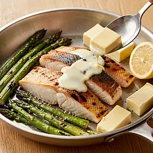 Dopraw całość odrobiną świeżo zmielonego pieprzu i ewentualnie skrop dodatkową ilością soku z cytryny do smaku. Podawaj natychmiast — danie najlepiej smakuje zaraz po przygotowaniu, gdy szparagi są jeszcze ciepłe i chrupiące, a filet soczysty.