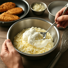 Delikatnie połącz masę serową z ubitą pianą: do miski z serami nałóż 1/3 piany białkowej i energicznie wymieszaj (to rozluźni masę). Następnie dodaj pozostałe białka w 2 partiach, delikatnie składając je dużą szpatułką ruchem od dołu do góry — celem jest zachowanie puszystości. Masa powinna być lekka, puszysta i jednolita, przypominać chmurkę.