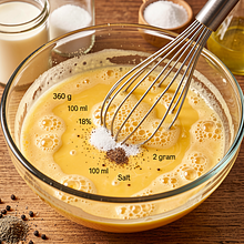 W dużej misce wbij jajka (360 g = 6 szt.). Dodaj śmietanę 18% (100 ml), sól (2 g) i pieprz (1 g). Ubij rózgą lub widelcem energicznie przez około 30–60 sekund, aż masa stanie się jednolita i lekko spieniona — pęcherzyki powietrza dodadzą lekkości frittacie.
