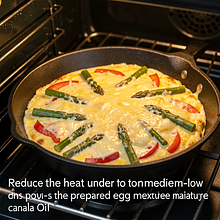 Zmniejsz ogień pod patelnią do średnio‑niskiego. Wlej przygotowaną masę jajeczną równomiernie na warzywa. Delikatnie przemieszaj łyżką, aby jajka weszły między warzywa. Smaż 2–3 minuty, aż brzegi zaczną się ścinać, a środek będzie jeszcze lekko płynny. Posyp równomiernie starty ser żółty (100 g) na wierzchu. Wstaw patelnię do rozgrzanego piekarnika z funkcją grill/termoobieg ustawionego na 200–220°C (środkowa półka, 3–5 minut) aż wierzch ładnie się zarumieni i środek będzie ścięty. Alternatywa bez piekarnika: przykryj patelnię pokrywką i gotuj na bardzo małym ogniu 6–8 minut aż masa się zetnie.