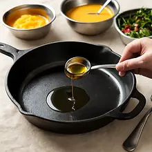 Postaw patelnię na średnim ogniu i smaż bez przykrycia 4-5 minut: krawędzie masy powinny się ściąć i lekko zrumienić, środek będzie jeszcze miękki i płynny. Możesz lekko poruszyć patelnią — masa powinna się poruszać, ale nie być całkowicie płynna.