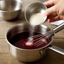 Zdejmij rondel z ognia i odczekaj 1–2 minuty, aby płyn lekko przestygł (ma być ciepły, nie gorący). Sprawdź, czy żelatyna po napęcznieniu ma gładką, wilgotną konsystencję. Wlej kilka łyżek ciepłej (nie wrzącej) mieszanki wina do miseczki z napęczniałą żelatyną i energicznie wymieszaj widelcem lub małą trzepaczką, aby rozpuścić żelatynę bez grudek. Następnie wlej rozpuszczoną żelatynę z powrotem do rondla i dokładnie wymieszaj, aż będzie całkowicie jednorodna — nie powinno być widocznych ziarenek żelatyny.