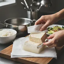 Wyjmij tofu z opakowania i delikatnie osusz je ręcznikiem papierowym. Połóż blok tofu na desce do krojenia wyłożonej 2-3 warstwami ręcznika papierowego. Przykryj tofu kolejnymi warstwami ręcznika, a na wierzchu umieść coś ciężkiego, np. grubą książkę lub patelnię żeliwną. Pozostaw pod obciążeniem na minimum 30 minut. Ten proces, zwany prasowaniem, usuwa nadmiar wody, co sprawi, że tofu będzie bardziej zwarte i chrupiące po usmażeniu.