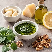 Przygotuj pesto: umyj i osusz szczaw, usuń grube łodygi. Do blendera włóż szczaw, obrany czosnek (1 ząbek), orzech włoski, 30 g parmezanu, sok z połowy cytryny (ok. 15-20 g), 30 g oleju rzepakowego i połowę soli. Zmiksuj pulsacyjnie aż składniki się połączą w gęste pesto. Jeśli pesto jest zbyt gęste, dodaj pozostały olej po łyżce.