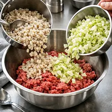 Przygotuj pęczak: wsyp 120 g suchego pęczaku do sitka i przepłucz pod bieżącą zimną wodą, mieszając ręką aż woda będzie przejrzysta. Przełóż do garnka, zalej 360 ml (3 × objętość kaszy) zimnej wody, dodaj szczyptę soli (ok. 1 g) i doprowadź do wrzenia. Zmniejsz ogień do małego, przykryj i gotuj 25–30 minut, aż kasza będzie miękka, ale nie rozgotowana (powinna być pełna, lekko sprężysta). Odcedź nadmiar wody, rozluźnij widelcem i odstaw do ostudzenia.