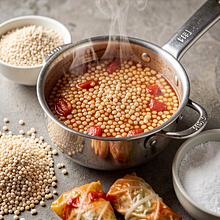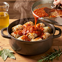 Tradycyjne polskie gołąbki w nowoczesnym wydaniu: zamiast ryżu używamy pęczaku, co daje daniu ziarnistą strukturę i głębszy, orzechowy posmak. Gołąbki to zawijane liście kapusty nadziane farszem mięsnym z kaszą i warzywami, duszone w aromatycznym sosie pomidorowym. Przepis łączy domowy komfort z nutą regionalnej prostoty – pęczak jest popularny w polskich kuchniach, a sos pomidorowy można wzbogacić śmietaną lub podsmażonym boczkiem. Danie świetnie pasuje do ziemniaków z wody, zasmażanej kapusty lub po prostu świeżego chleba. Wizualnie: złociste gołąbki, czerwony, błyszczący sos i zielone listki pietruszki nadają kontrast i apetyczny wygląd.