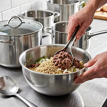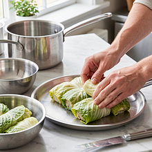 Przygotuj główkę kapusty: odetnij zewnętrzne, brudne liście. Przeciąć głąb (twardy trzon) ukośnie nożem, ale nie wykręcaj go całkowicie — ułatwi to oddzielanie liści. Włóż całą główkę do dużego garnka z wrzącą, osoloną wodą (ok. 2 łyżeczki soli na 2 litry). Gotuj 5-7 minut na dużym ogniu, aby liście stały się elastyczne; jeśli liście nadal są bardzo twarde, gotuj kolejne 2-3 minuty.