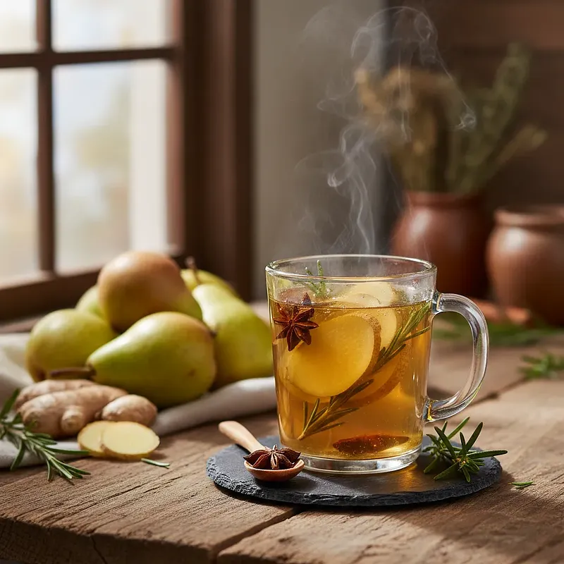 Przygotuj dwa kubki lub szklanki odporne na wysoką temperaturę. Ustaw na nich małe sitko o drobnych oczkach i ostrożnie przelej gorący napój, aby odcedzić drobne kawałki imbiru. Jeśli używasz opcjonalnej gruszki, umyj ją, pokrój w cienkie plasterki i włóż po kilka do każdej szklanki. Na koniec udekoruj każdą porcję świeżą gałązką rozmarynu. Podawaj natychmiast, póki napój jest gorący.