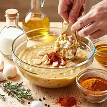 Przygotuj marynatę: do średniej miski wlej 250 ml piwa jasnego. Dodaj 30 g musztardy i 30 g oleju rzepakowego (2 łyżki). Cebulę obierz i zetrzyj na tarce o grubych oczkach bezpośrednio do miski (użycie tarki uwolni sok i cukry). Czosnek (3 ząbki) przeciśnij przez praskę lub drobno posiekaj i dodaj do mieszanki. Dosyp 6 g słodkiej papryki, 4 g majeranku, 10 g soli i 2 g pieprzu czarnego. Jeśli używasz miodu, dodaj 15 g teraz — pomoże uzyskać glazurę podczas grillowania. Wymieszaj energicznie widelcem lub trzepaczką aż składniki połączą się w jednorodną emulsję.
