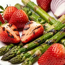 Grilluj szparagi 4-6 minut, przewracając co 1-2 minuty, aż będą lekko zrumienione i jędrno-miękkie. Cebulę grilluj 6-8 minut, aż stanie się miękka i pojawią się ciemniejsze paski. Truskawki kładź na grillu ostatnie 1-2 minuty, skórą do rusztu, przewróć jeśli chcesz lekko zmiękczyć z obu stron — mają się tylko lekko przyrumienić, nie rozpadać.