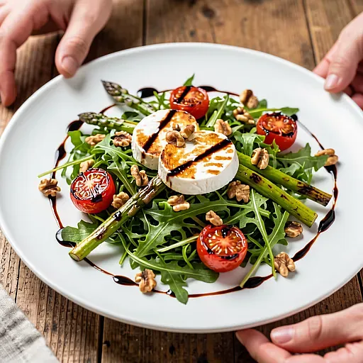 Nowoczesna, lekka sałatka łącząca piekący aromat grillowanych pomidorków i (opcjonalnie) szparagów z pieprzną świeżością rukoli oraz kremowym serem kozim. Danie ma wyraźny kontrast temperatur i tekstur: gorące, lekko skarmelizowane warzywa, chłodna rukola i miękki ser. Doskonała jako przystawka na wiosenne spotkanie lub lekki obiad. Podawać z chrupkim pieczywem i kieliszkiem schłodzonego wina białego lub lekkiego piwa. Estetycznie prezentuje się na dużym, płaskim talerzu — intensywna zieleń rukoli, rumiane pomidorki i białe krążki sera tworzą nowoczesny, efektowny talerz.
