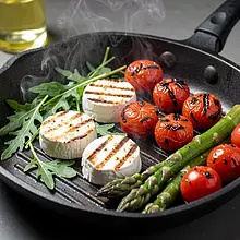 Grilluj pomidorki 2–4 minuty, obracając co 30–60 sekund, aż skórka zacznie pękać i pojawią się ciemne, nitkowate znaki przypieczenia. Szparagi grilluj 4–6 minut, obracając co 1–2 minuty — powinny być jędrne, ale sprężyste (testuj widelcem: łatwo się wbijają, ale nie rozpadają). Na koniec szybko podsmaż krążki sera koziego 30–60 sekund z każdej strony na lekko natłuszczonej powierzchni, aż nabierze złotego koloru i delikatnie się ogrzeje.