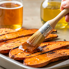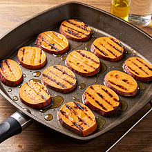 Rozgrzej grill zewnętrzny do średnio-wysokiej temperatury (ok. 200–220°C) lub rozgrzej patelnię grillową na średnim ogniu. Posmaruj ruszt lub powierzchnię patelni cienką warstwą oleju (użyj pędzelka lub kawałka papieru kuchennego na szczypcach). Układaj plastry batata w odstępach, aby miały miejsce na przepływ powietrza i kontakt z gorącą powierzchnią.