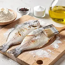 Przypraw filety z obu stron solą i pieprzem (użyj około połowy soli), a następnie oprósz cienko mąką — potrząśnij lekko, aby nadmiar mąki odpadał. Posmaruj cienko olejem rzepakowym po stronie skórki i delikatnie rozprowadź pędzelkiem.