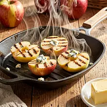 Delikatnie skarmelizowane grillowane jabłka nadziewane kremowym serem pleśniowym i polane miodem — prosty, wiosenny deser w wersji wegetariańskiej. Danie łączy słodycz soczystego jabłka z kremową, słono-kwaśną nutą sera pleśniowego i aromatem cynamonu. Idealne na lekki koniec posiłku, do kawy lub na garden party. Podawać ciepłe, z chrupiącymi orzechami dla kontrastu tekstur i opcjonalną skórką cytrynową dla świeżości.